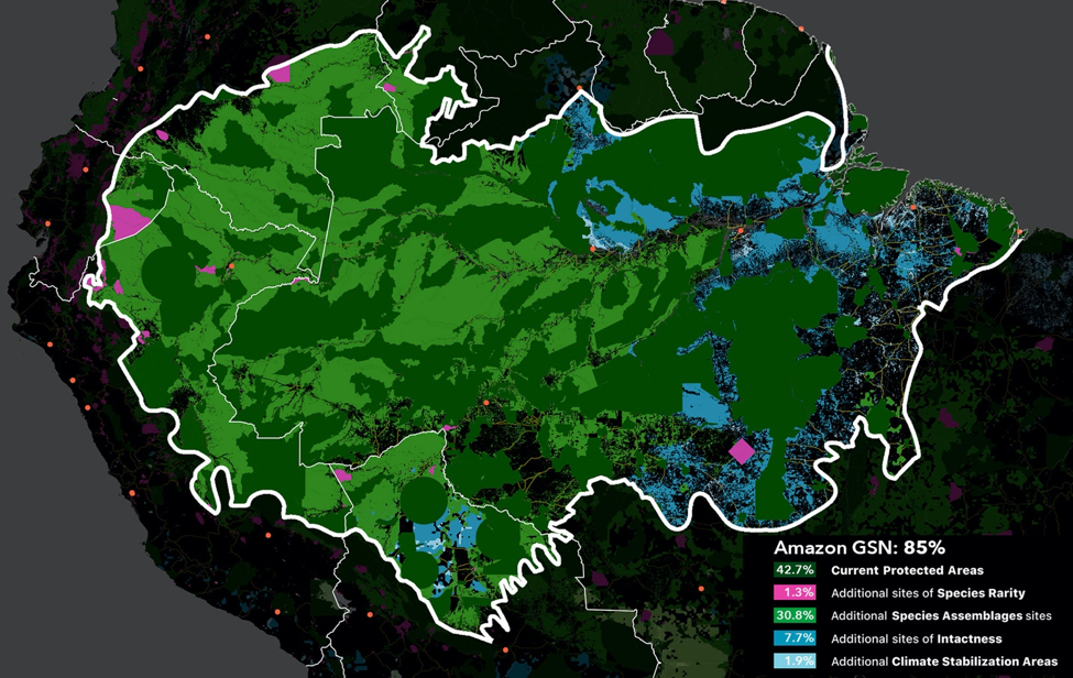 The ‘Global Safety Net’ for the Amazon: 85% of land is important for the preservation of biodiversity and carbon storage. Credit: Karl Burkart, One Earth