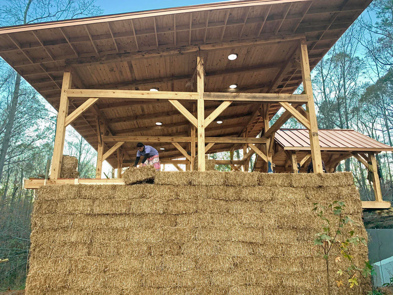 Building strawbale wall system for Ekvn-Yefolecv's two-story feed storage/microgreens growing/chicken hatchery building. Image credit: Courtesy of Ekvn-Yefolecv