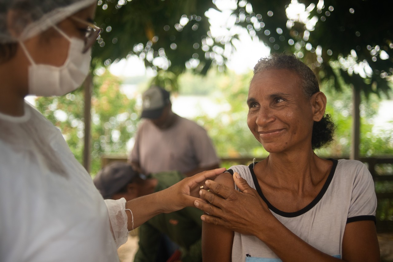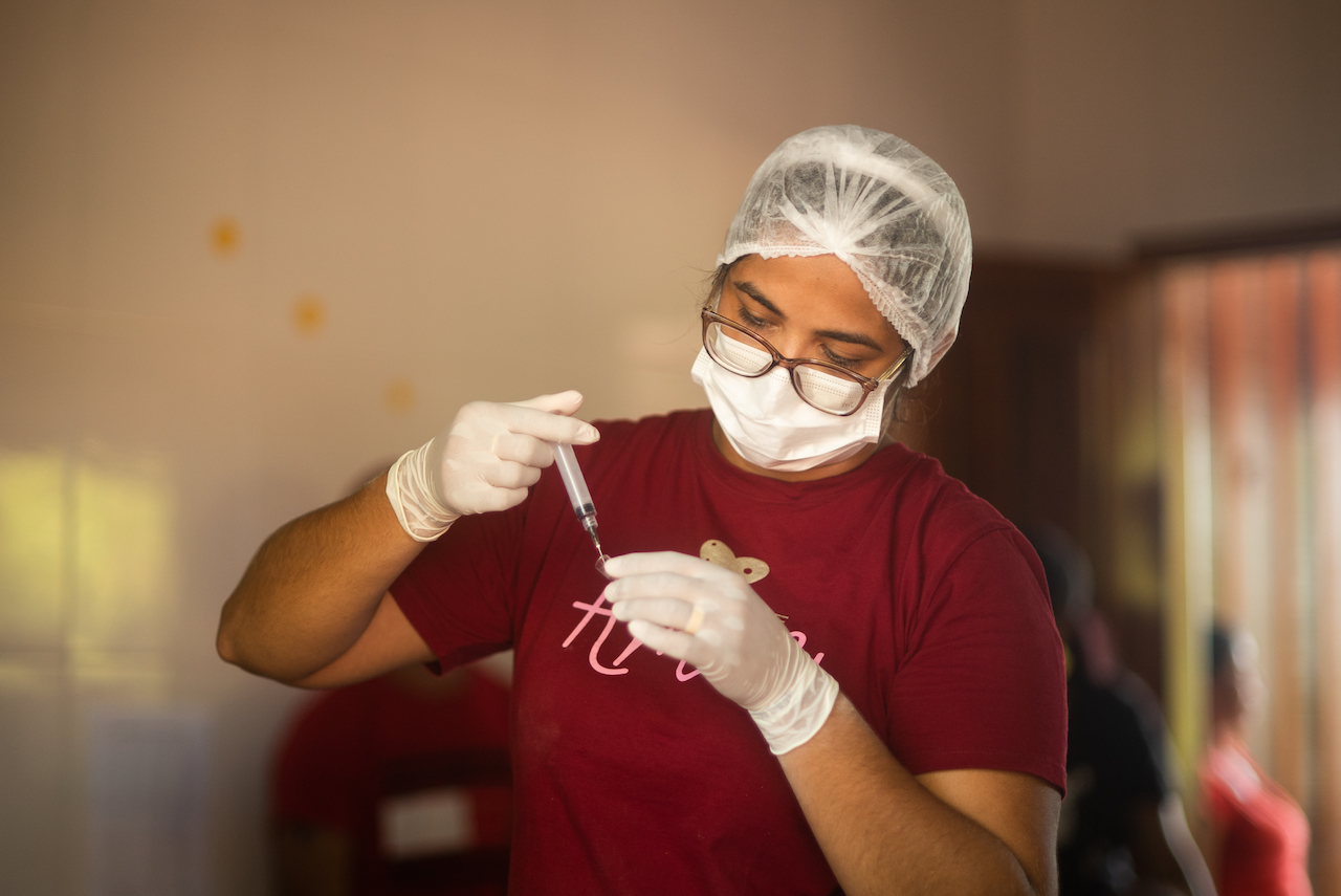 Providing COVID-19 vaccinations and healthcare services in the Xingu River Basin (Amazon Rainforest, Brazil), 2021. Image credit: Courtesy of Isadora Brant